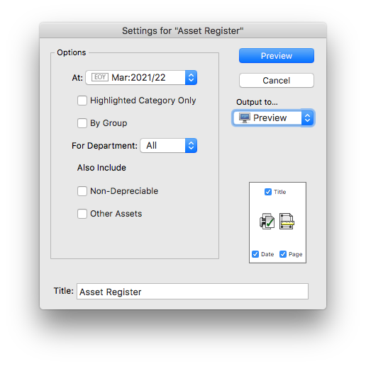 For Department: To just list the assets for a nominated department, select the department from the pop-up menu. This is based on the Department field in each asset record.