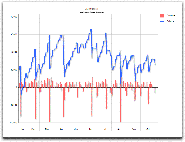 This report (which is in the Cash section of the Reports menu) prepares a list of all transactions from the nominated date against the specified bank account. The report includes a running balance and can optionally show the first few allocations (although this makes the report run noticeably slower). If the Daily Graph option is selected, a chart like the one below is also prepared.