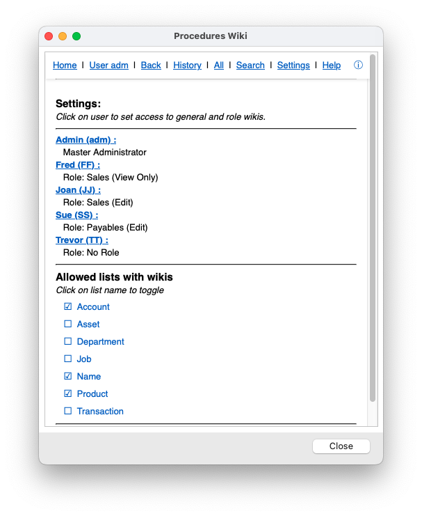 The Settings link in the wiki navigator controls who can access and amend wiki pages, and what lists in MoneyWorks can have wikis associated with them. It displays all the users and their role, and the MoneyWorks lists that can have a wiki attached.